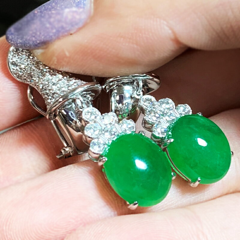 翡翠がゆらゆらと耳元で美しく揺れ、上質なパヴェダイヤは輝きと存在感を放ちます。